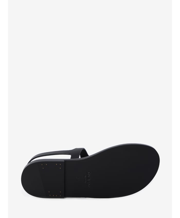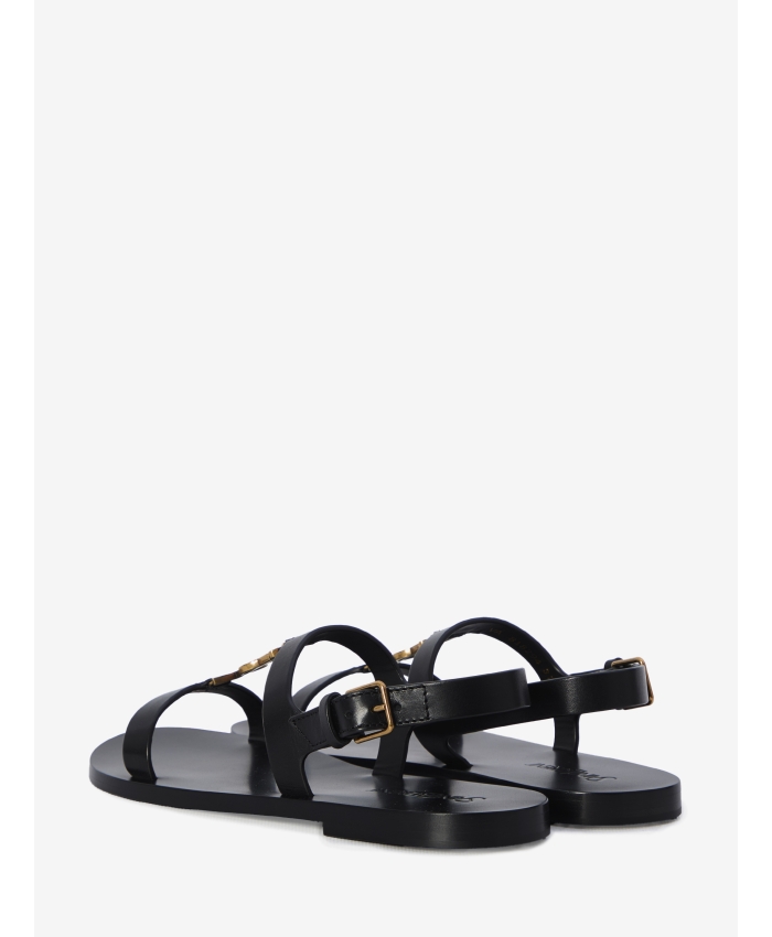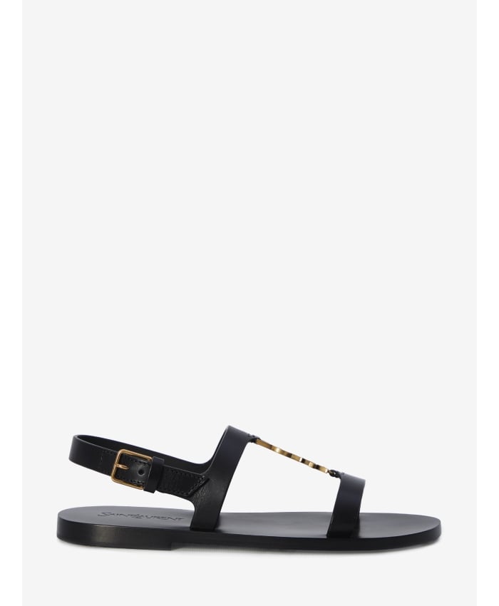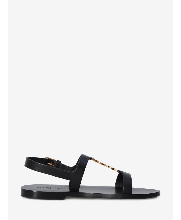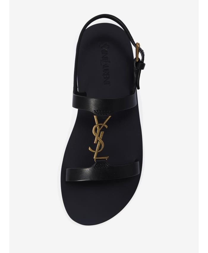 Flat sandals in black calfskin leather with a wide T-strap decorated with metal Cassandre details at the front. They feature an adjustable buckle strap and a leather sole. Dust bag included. Any imperfections in the leather should not be considered manufacturing defects but rather a characteristic of the material.Heel height: 0,5cmITA size