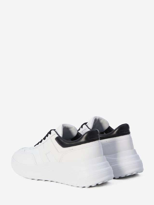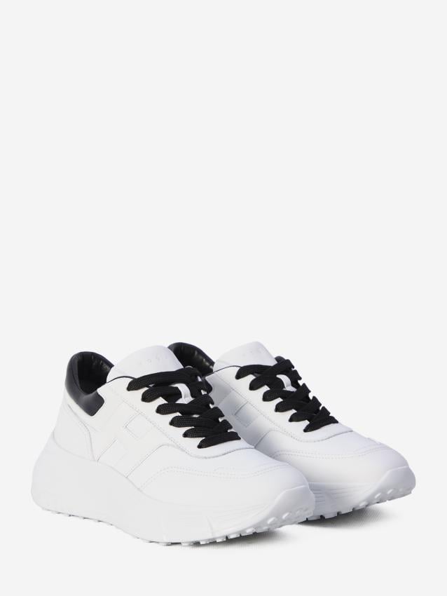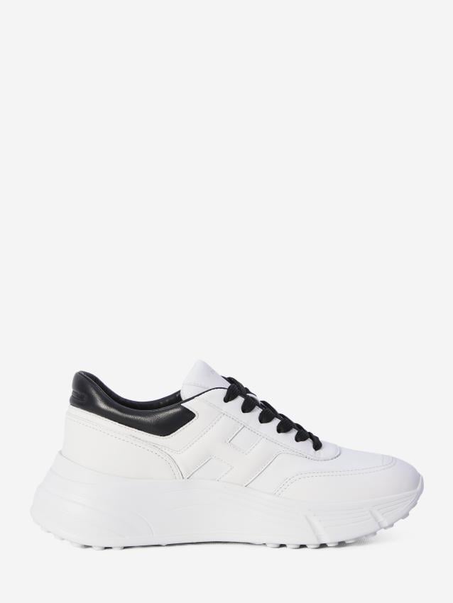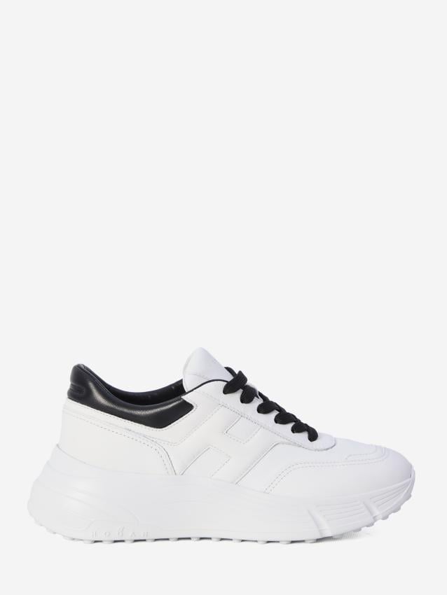 + Free ShippingHogan Hi-Fi sneakers in white and black leather. They feature a white leather H detail on the sides, a lace-up closure, a black leather upper edge, a logo on the tongue, a memory foam insole, and a rubber sole with studs. A dust bag is included. Additional laces are also included. Any imperfections in the leather should not be considered manufacturing defects, but rather a characteristic of the material. ITA size Sole height: 6,5cm