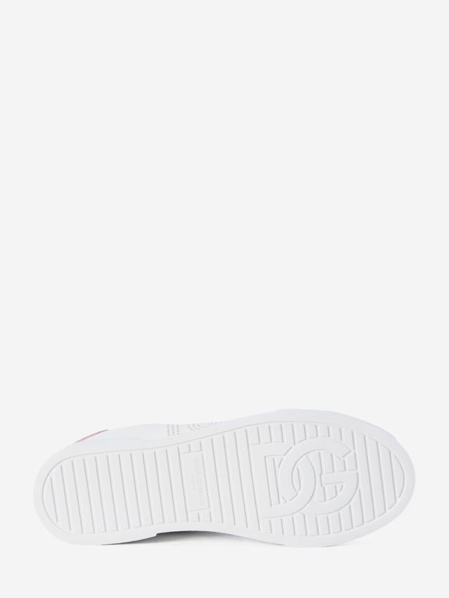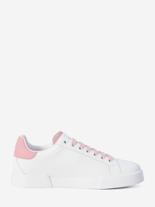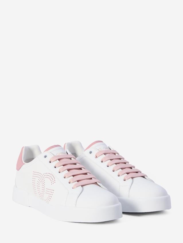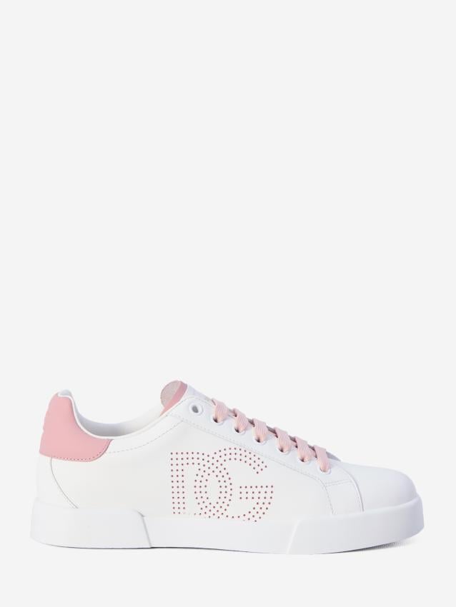 + Free ShippingPortofino Light Strobel sneakers in white and pink calf leather. They feature a round toe, pink lace-up closure, perforated DG logo on the side, embossed logo on the label with a pink insert, engraved DG logo on the pink leather heel, and a rubber sole. Dust bag included. Any imperfections in the leather are not factory defects but a characteristic of the material. ITA size