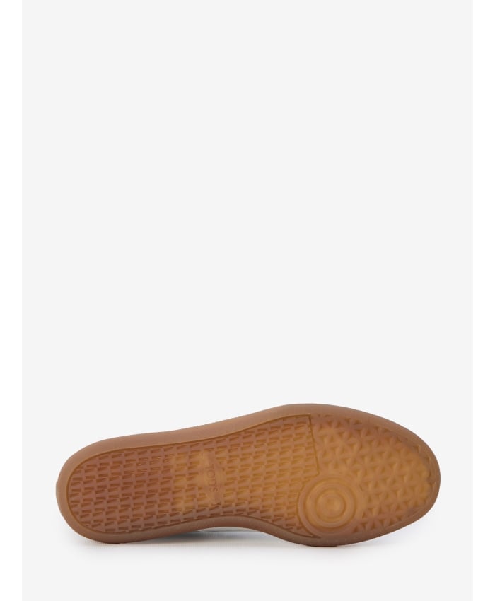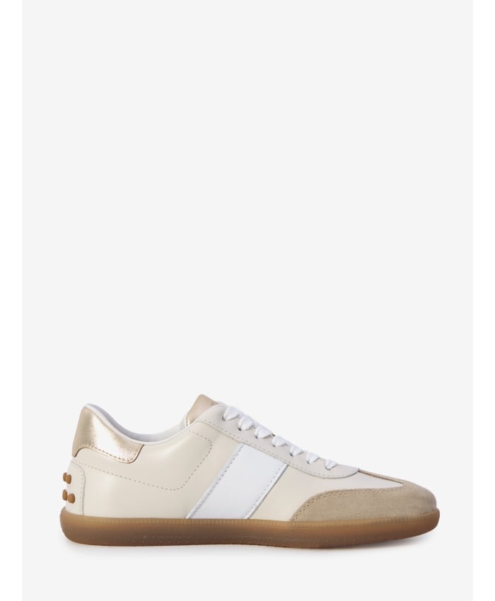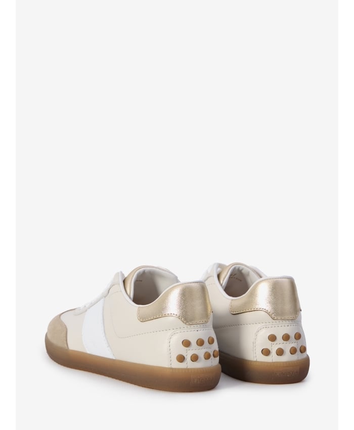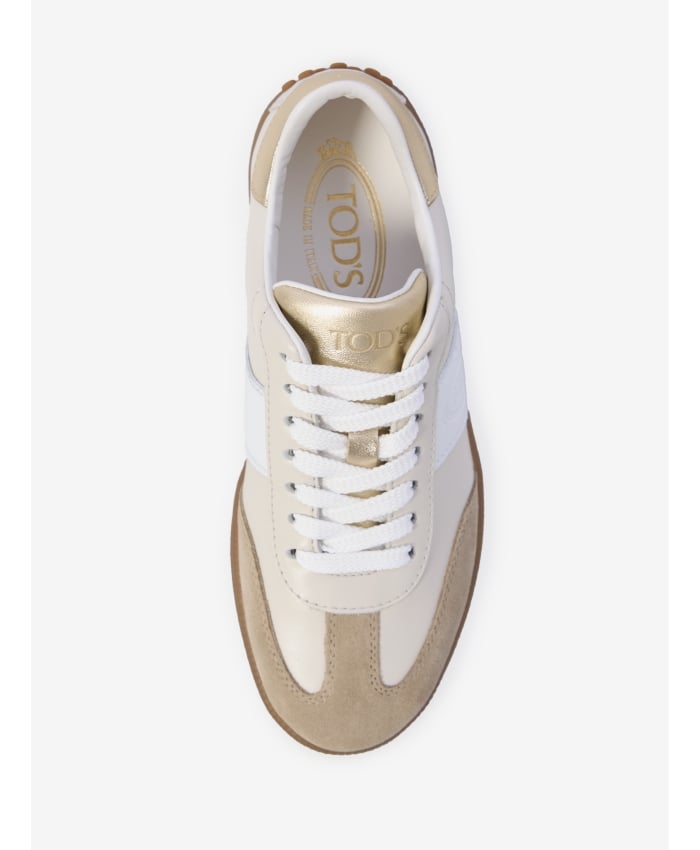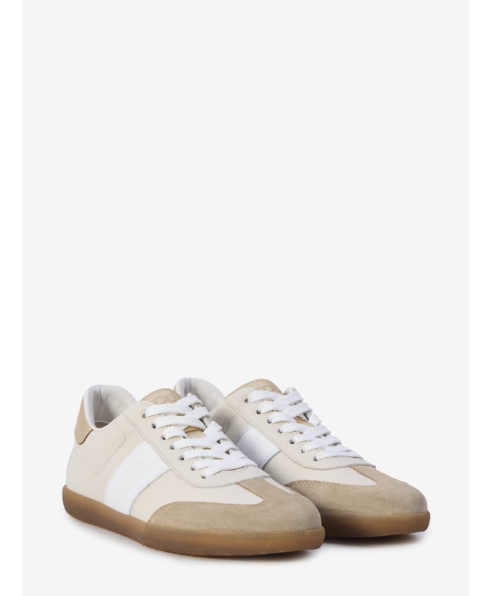 Cream soft leather Tabs sneakers with a beige suede toe. They feature the Tod’s logo embossed on a white leather insert on the sides, lace-up closure, heel detail with rubber pebbles, golden leather tongue with embossed logo, golden leather insert on the heel, and rubber sole. Dust bag included. Additional laces included. Any leather imperfections are not to be considered manufacturing defects, but a peculiarity of the material.ITA size